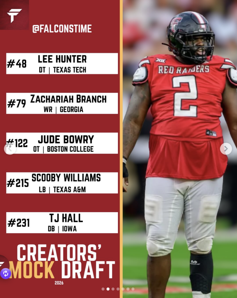 Their prediction has Atlanta drafting defensive tackle Lee Hunter out of Texas Tech in the second round followed by Zachariah Branch, Jude Bowry, Scooby Williams, and TJ Hall.