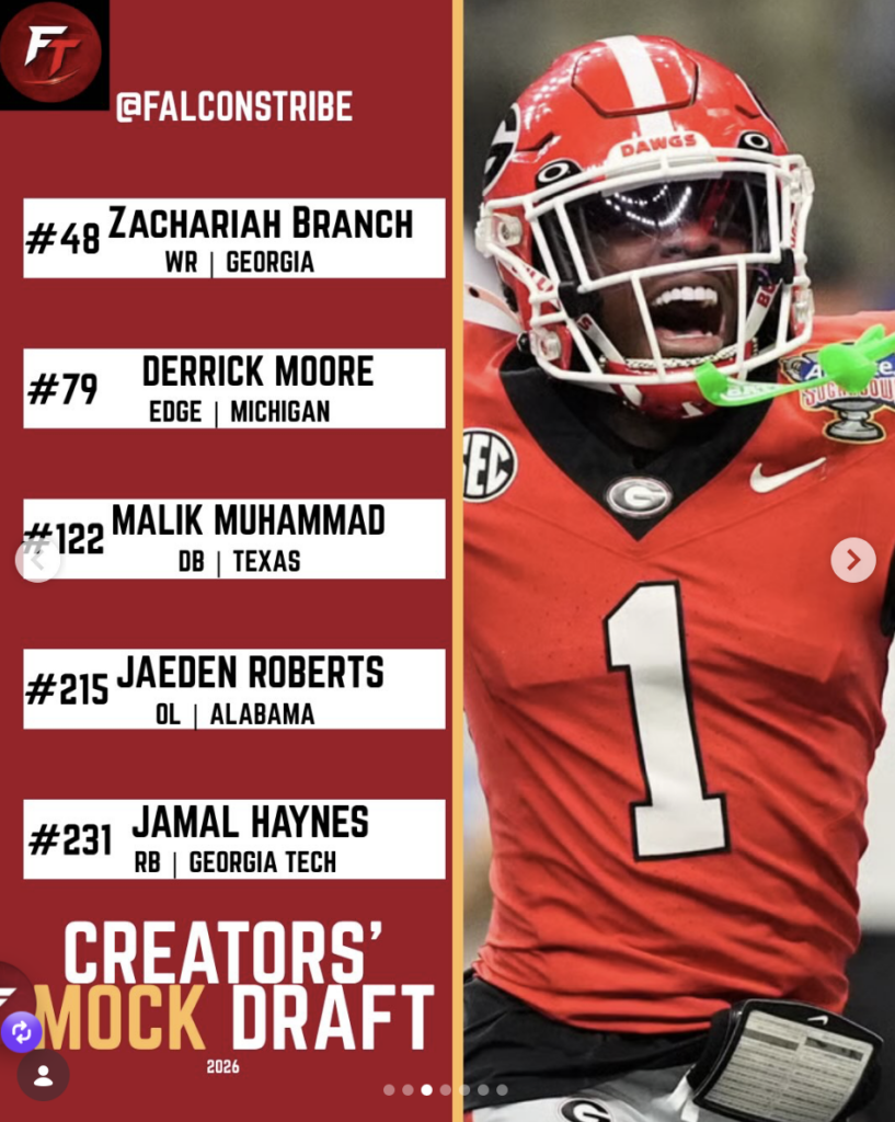 FalconsTribe went with Bulldog Zachariah Branch with Atlanta’s second round selection followed by Derrick Moore, Malik Muhammad, Jaeden Roberts, and Jamal Haynes.