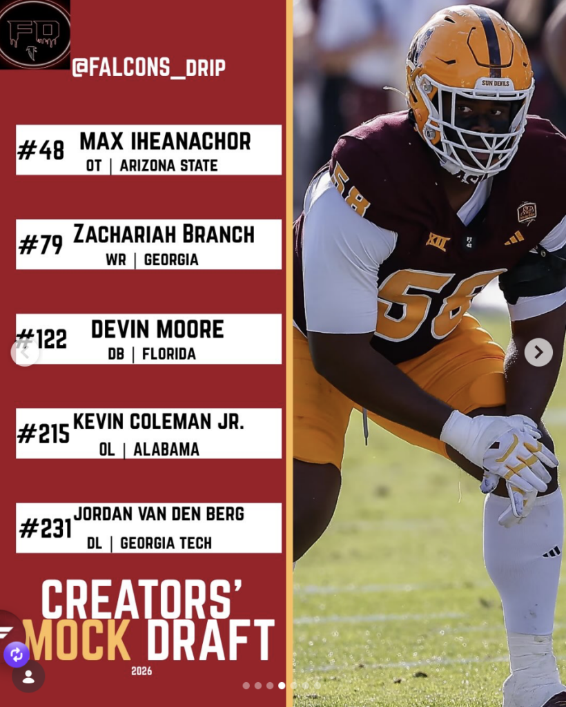 Offensive line took priority here with Max Iheanachor going at pick 48. That was followed up with the common denominator in these mock draft: Zachariah Branch going at pick 79. @Falcons_Drip then went with Devin Moore, Kevin Coleman Jr. and Georgia Tech product Jordan Van Den Berg to round out their mock.