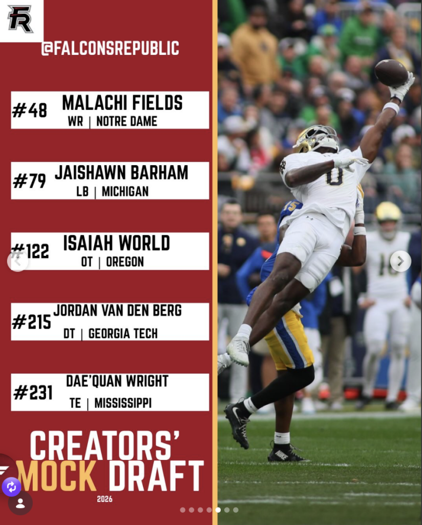 He has the Falcons drafting another Notre Dame product this year in WR Malachi Fields. That pick was followed up by Jaishawn Barham, Isaiah World, Jordan Van Den Berg once again out of Georgia Tech, and Dae’Quan Wright.