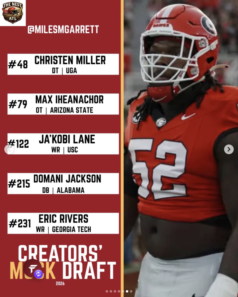 Garrett went with UGA product Christen Miller with the Falcons second round selection. Atlanta had brought in Miller for a top 30 visit recently and had a strong showing at Georgia’s Pro Day weeks ago. Max Iheanachor was the next pick at 79 — although many mocks have him going much higher than that. Garrett crossed off wide receiver with Ian Cunningham electing to take another USC pass-catcher alongside Drake London: Ja’Kobi Lane. Domani Jackson and Eric Rivers rounded out The Nest ATL’s picks for the Falcons.