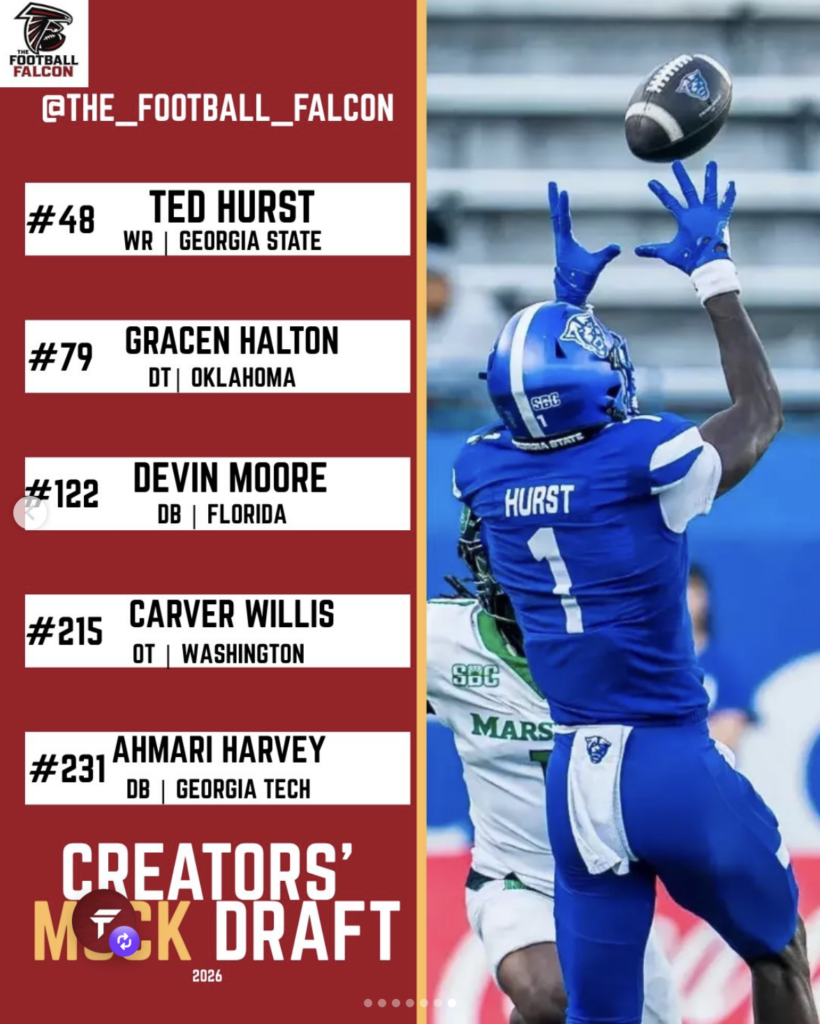 Their second round pick was a fan favorite, and local Georgia State product, Ted Hurst to fill out Atlanta’s pass catching need. Hurst was also recently brought in for a top 30 visit by the Falcons. That was followed by Gracen Halton, Devin Moore, Carver Willis, and Ahmari Harvey.